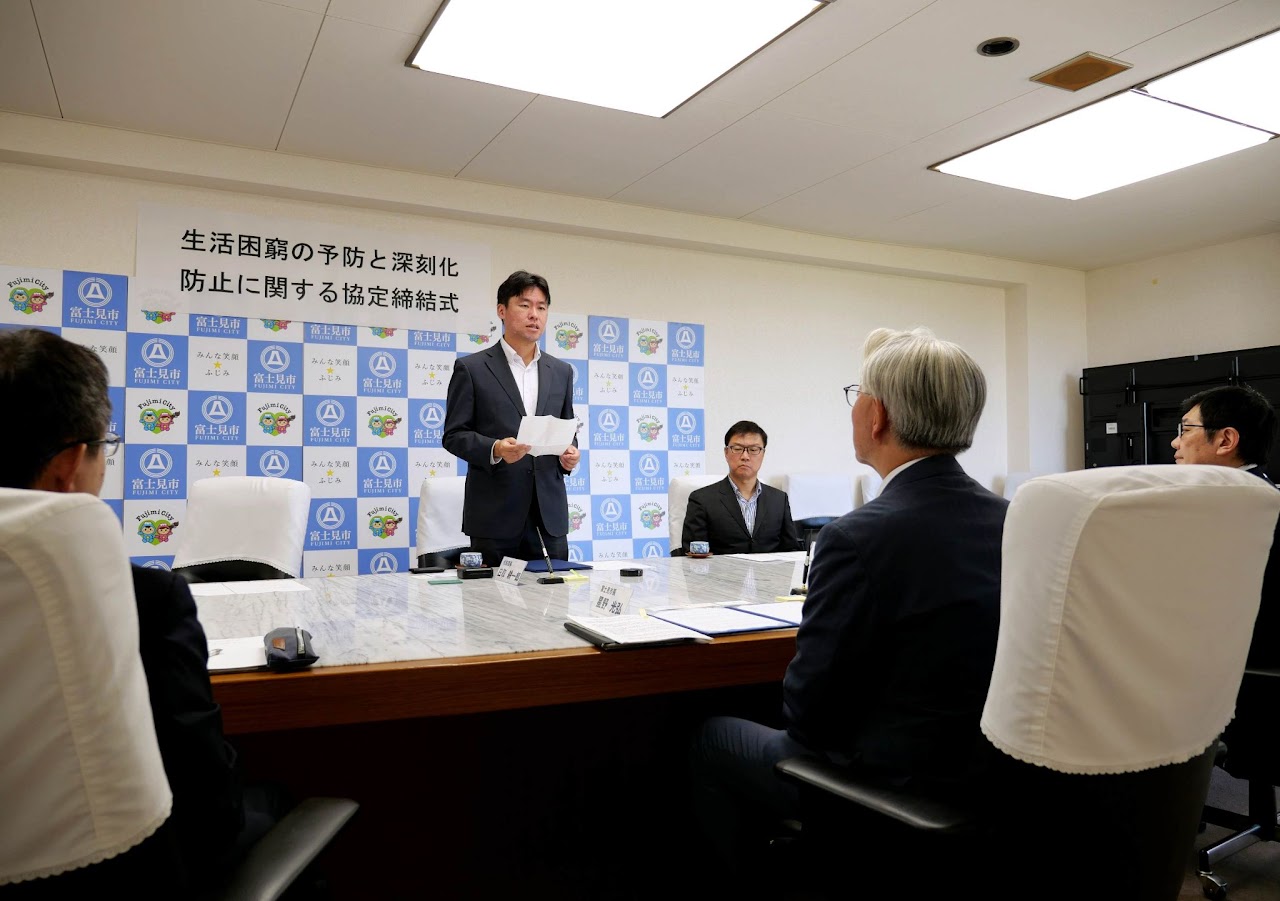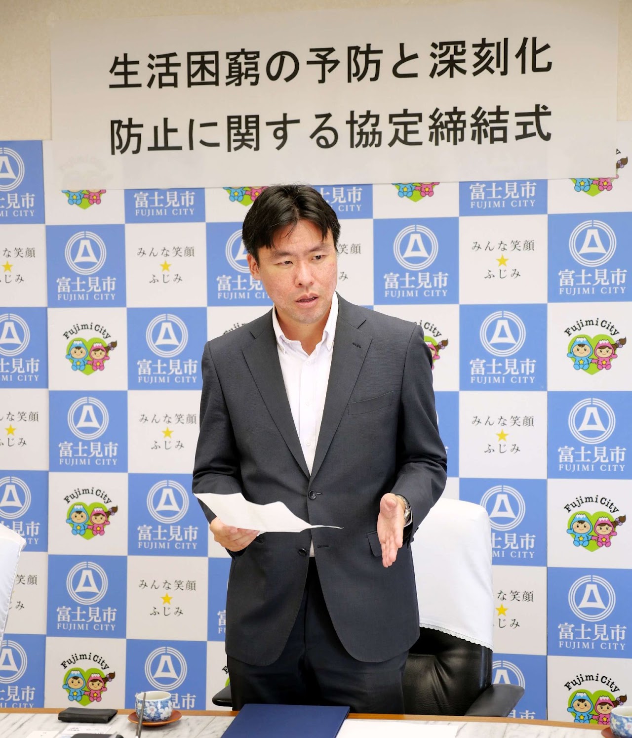 市役所で開催された締結式で富士見市の星野光弘市長は「これまで生活困窮で苦しむ子供達への対策など、富士見市は独自に部署を設立して取り組んできましたが、生活困窮対策は部署を越えた対応が必要だと感じていました。防窮という考え方を取り入れることで、生活困窮に陥る前に防ぐ対策であったり、役所の窓口に相談に来るのは恥ずかしいことと考えて隠れてしまっていた生活困窮者を助ける効果を期待しています」と語られました。